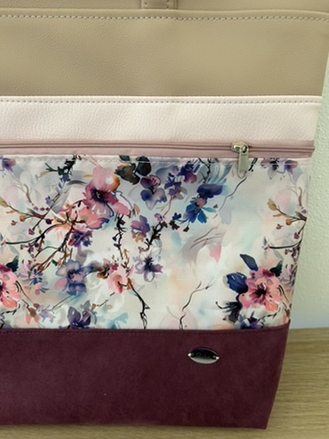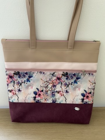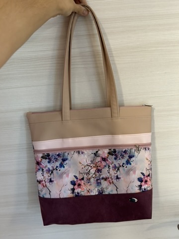 Torba v velikosti 38 x 35 cm z dnom širine 9 cm. Vanjo lahko pospravimo A4 zvezek ali mapo s sponkami, peresnico, denarnico, telefon, flaško vode in še kakšno drobnarijo. Zunanjost je iz umetnega usnja v puder roza barvi, nepremočljivega poliestra s cvetličnim vzorcem in trpežne tapetniške mikrotkanine v vijolični barvi. V notranjosti je bombažna podloga (enobarvna ali s pikami). Ima zunanji in notranji žep. Zapira se z zadrgo. Naramnice so iz usnja.